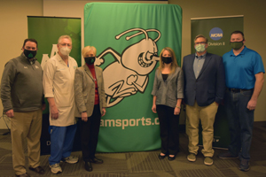 UAM Vice Chancellor for Advancement Jeff Weaver, Mainline physician Dr. Kerry Pennington, UAM Chancellor Dr. Peggy Doss, City Drug Pharmacist Nikki Hood, Mainline CEO Alan Nichols, and Prescription Pad Pharmacist Brian Smith pause during the COVID-19 vaccination clinics held at UAM