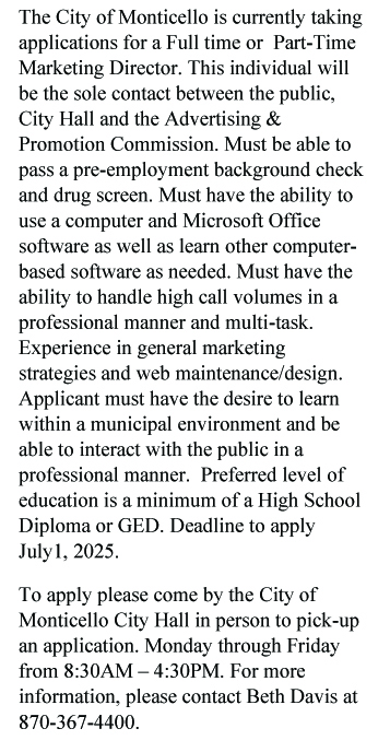 The City of Monticello will be closed for Christmas December 24, 25th, and 26th.