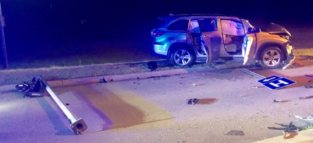 The tan Toyota Highlander was traveling south from the country club area, when it collided with a roadside traffic signal, and knocked down other road sign(s), when the crash occurred Monday morning April 15, around 2 AM.