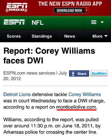 MonticelloLive.com’s Friday court photo and story about an NFL player’s Drew County DWI charge earned national attention. Phone calls came in from Detroit to Houston. Google shows the story was picked up and carried on sites from Oakland to Chicago to New York. The story was also covered by ESPN.