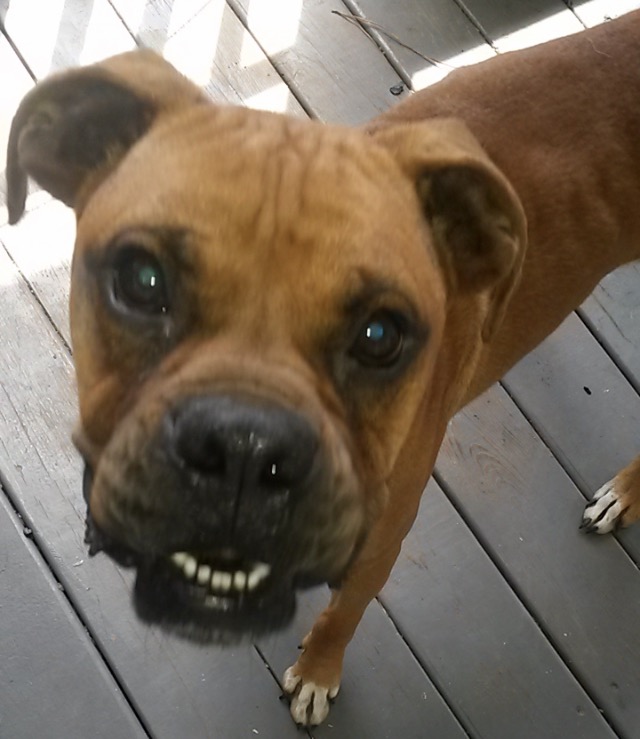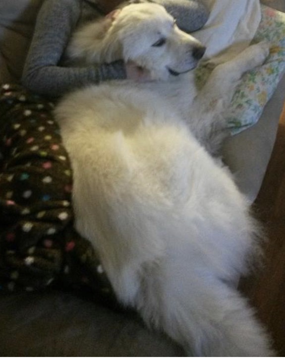 Samson is a white Great Pyrenees. He is a sweet dog but he does get very nervous and will growl. George is a brown Boxer. He is extremely friendly. George had a yellow sweatshirt on.