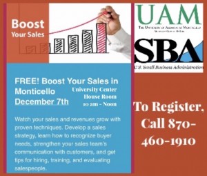 The first seminar, “Operating a Home-Based Business,” will be held November 30 from 9 to 11 a.m. in the Star City Civic Center. The second seminar, “Boost Your Sales,” will be held December 7 from 10 a.m. to 12 noon in the House Room of the John F. Gibson University Center on the UAM campus.