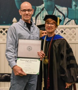 The University of Arkansas at Monticello presented a posthumous heavy equipment operator technical certificate to the late Mark Ellis of Monticello during December commencement on Saturday. Jim Ellis (left), a 2006 UAM CIS graduate and brother of the late Mr. Ellis, accepted the certificate from UAM Chancellor Karla Hughes.