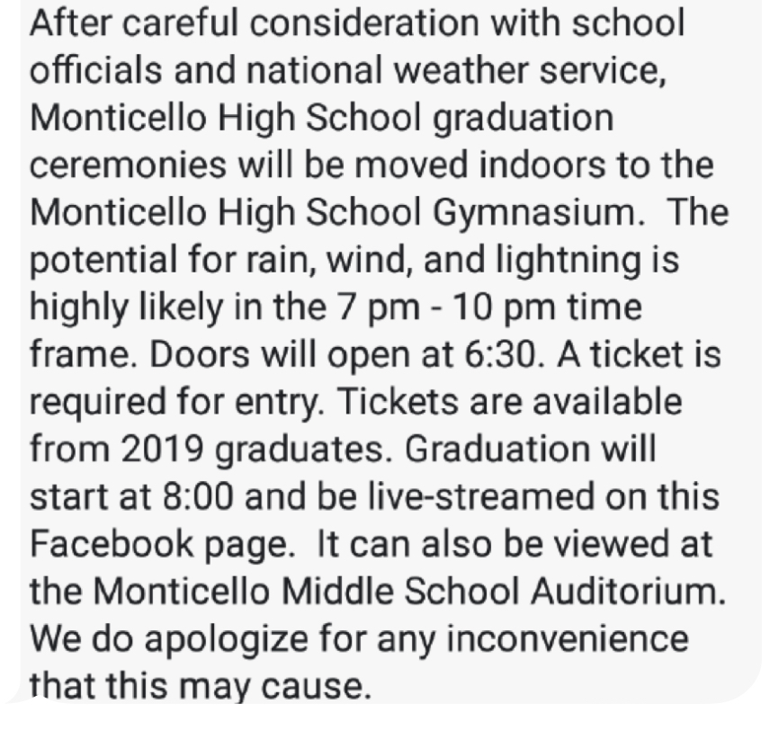Posted in Monticello School News | Comments Off on MHS Graduation Moved To Gym