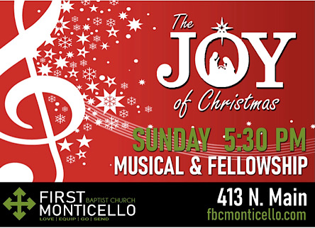 Immanuel Baptist Church, 939 Barkada Rd, in Monticello will host their Living Nativity December 13th and 14th, Come and Go, 6pm-8pm each night.