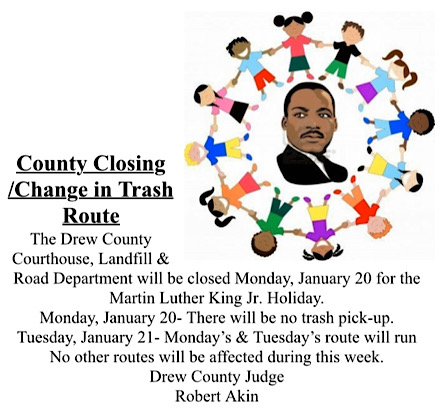 Akin also announced that the Drew County fairgrounds will have a tree and limb collection site, between the animal barn and rodeo arena.