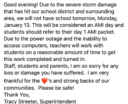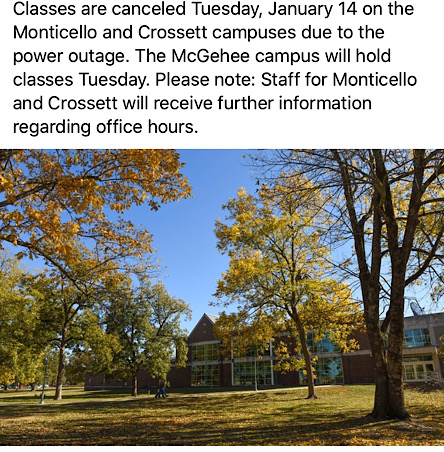 The UAM Monticello and Crossett campuses will be closed Monday, January 13 due to power outage. Critical personnel should report to both campuses.