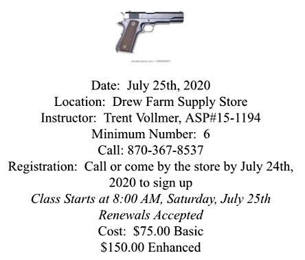 Posted in Business Center Ad | Comments Off on Conceal Carry Class, July 25, Drew Farm Store