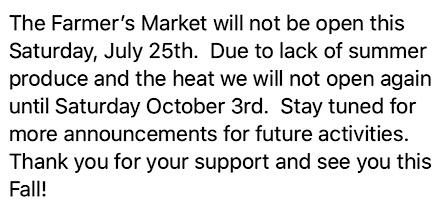 Posted in Announcements | Comments Off on Farmers Market Closing till October