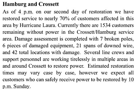 We expect that all customers who can safely receive power will be restored by August 30th at 10pm.