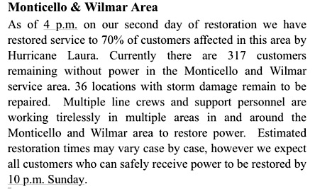 As of 4 PM, on August 28th, there are 603 customers without power in the Monticello and Wilmar service areas.