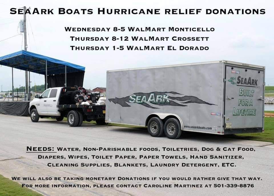 SeaArk will be collecting donations for hurricane victims in South Louisiana this week. We will be at Walmart in Monticello 8am -5pm Wednesday 9/30. Walmart in Crossett 8am-noon 10/01 and Walmart in El Dorado 1pm-5pm. Non perishible food items are a great need.