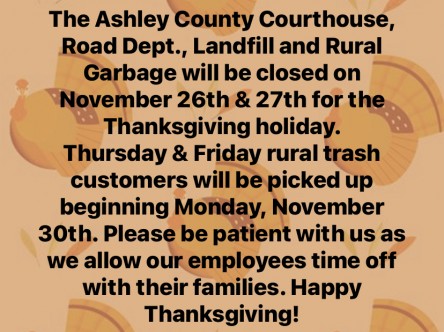 The Drew County Courthouse & Road Department will be closed on Wednesday, November 25, Thursday, November 26, and Friday, November 27, in observance of the Thanksgiving Holiday.