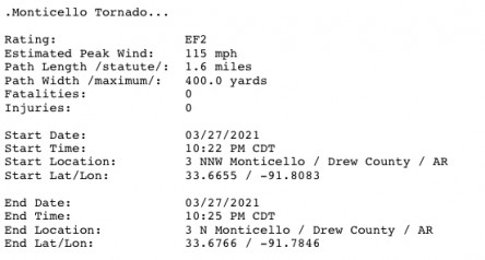 At 10:22 PM, Saturday evening, the National Weather Service confirmed an EF2 tornado touched down, just south of the Monticello northern city limits.