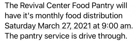 Posted in Announcements | Comments Off on Revival Center Food Pantry Open Saturday