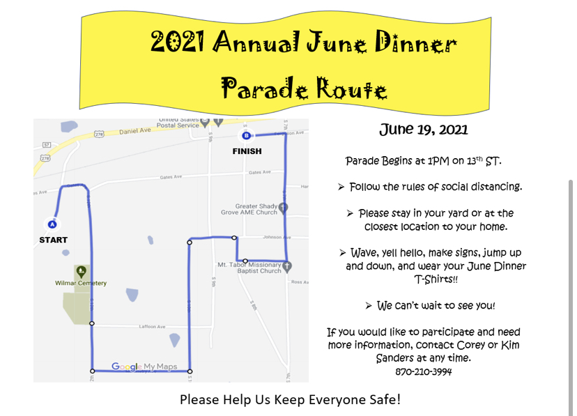 Back by popular demand”, the Annual June Dinner Parade will be taking the parade to the community. Citizens may be in their yards along the parade route. The route will be the same as last year 2020.