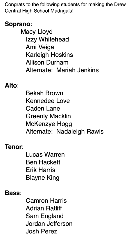 Posted in Drew Central News | Comments Off on Drew Cental Madrigals Named