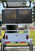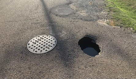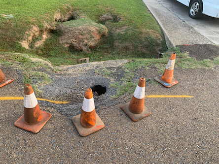 The smaller hole, shown here, was marked with cones, to be repaired later.
