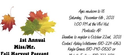 Posted in Announcements | Comments Off on Fall Harvest Pageant Deadline, Today
