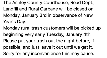 Posted in Ashley County | Comments Off on County New Years Schedule