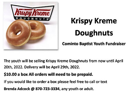 Posted in Church | Comments Off on Krispy Kreme Cominto Baptist Youth Fundraiser