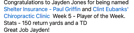 Posted in Sports | Comments Off on Billies Shelter Insurance – Paul Griffin and Clint Eubanks’ Chiropractic Clinic Week 5 – Player of the Week.