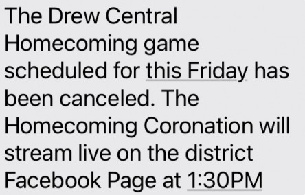 Drew Central Homecoming Update – Game Canceled, Coronation at 1:30 PM