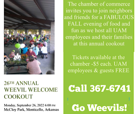 26TH ANNUAL WEEVIL WELCOME COOKOUT, Monday, September 26