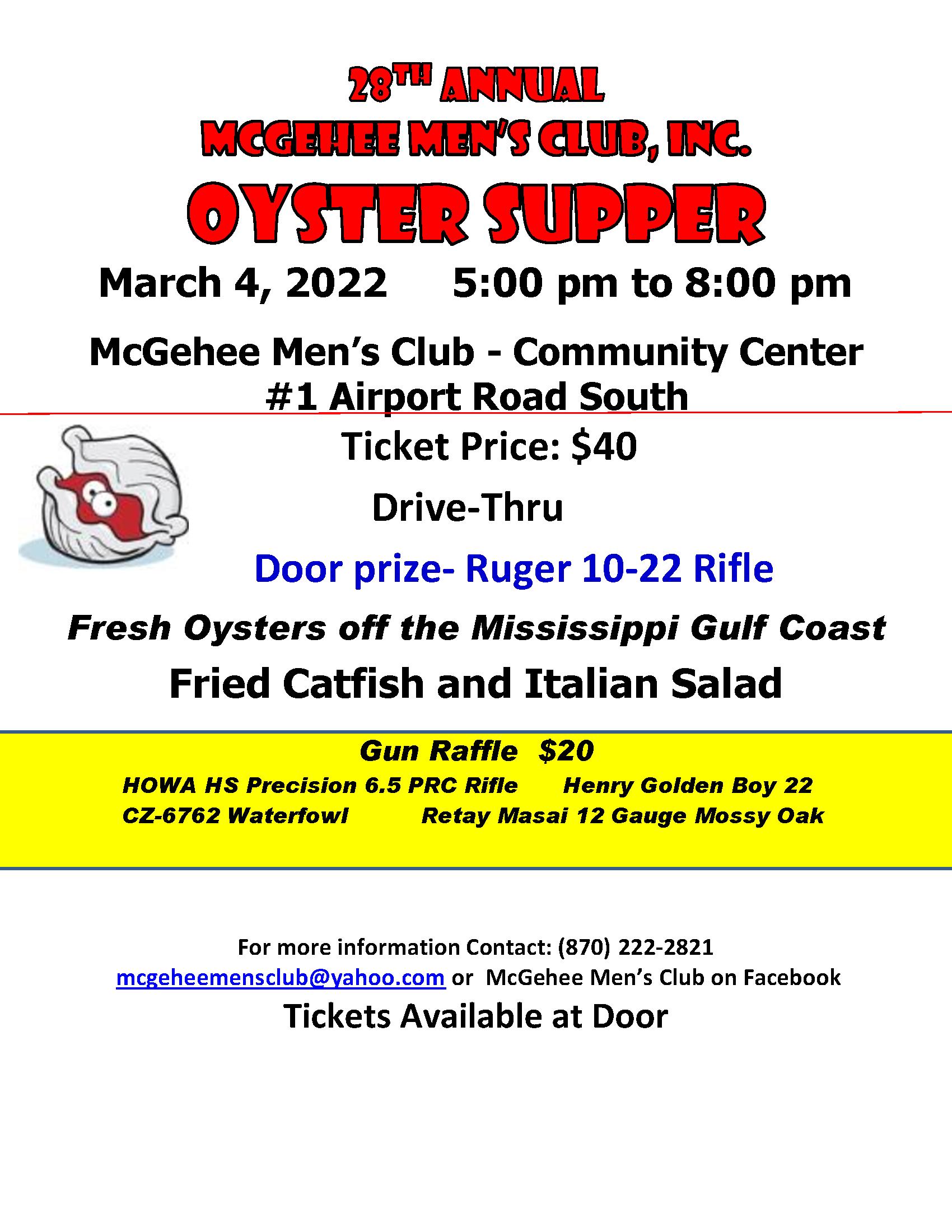28th Annual McGehee Men’s Club Oyster Supper, March 4th