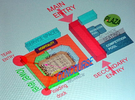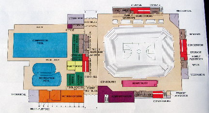 Many features were discussed, including a full-sized competition court, seating for 4,000, dressing rooms, locker rooms, and an Olympic-sized, 8-lane swimming pool.
