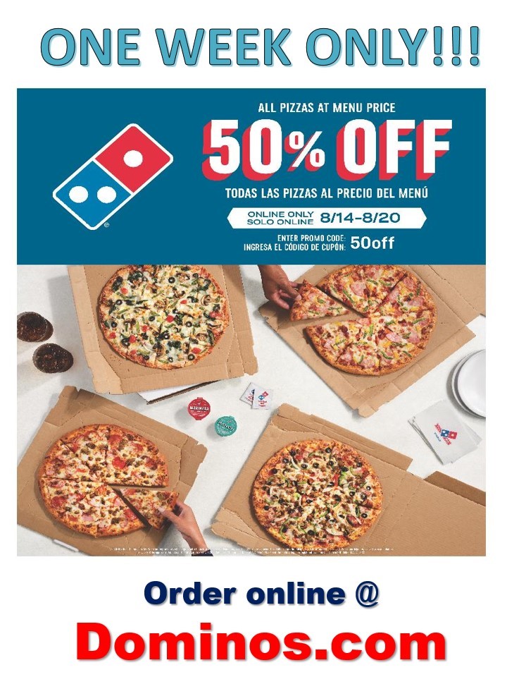50% Off All Pizzas At Menu Price Online At Domino’s 8/14-8/20