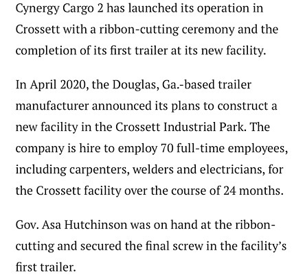 70 Jobs Coming to Crossett with Cynergy Cargo Trailer Industry