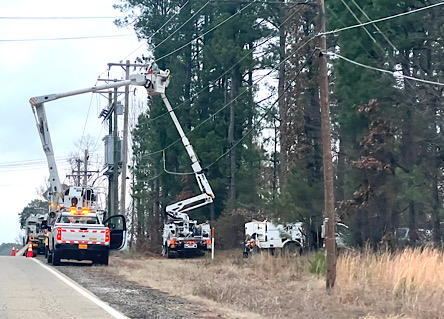 A collection of Entergy trucks and employees are gathered on S. Main St., south of Midway Route, working on the situation.