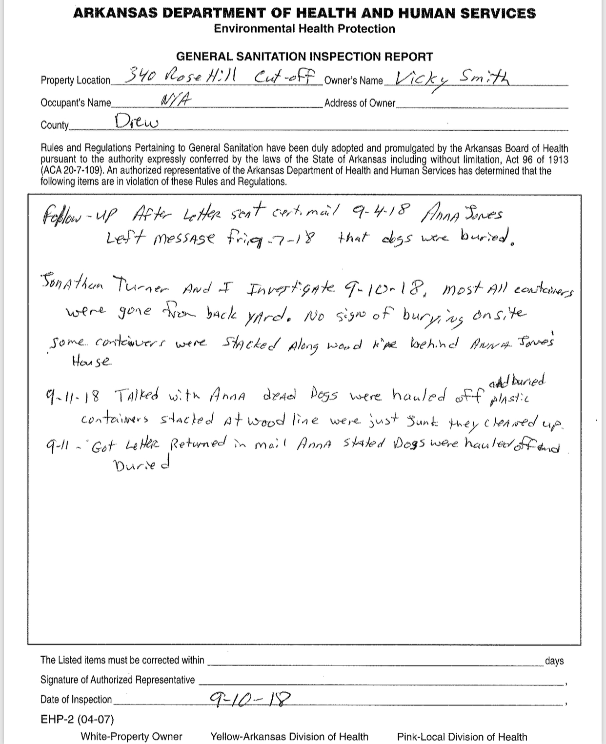 On September 10, in a follow up Health Dept report, the owners daughter told officials that the “dogs were buried,” but no other information was provided, except that the, “Dogs were hauled off and buried.”