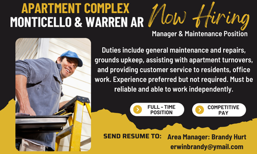 Apartment Complex In Monticello & Warren Now Hiring Manager & Maintenance Position