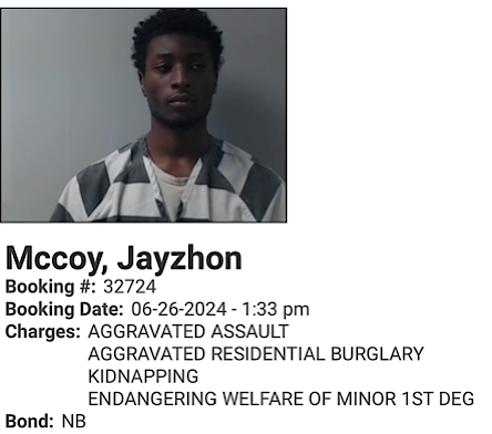 Three suspects from Warren have been arrested, a 15 year old male juvenile and two adults, Travion Jones, age 18, and Jayzhon McCoy, age 20. All three have been charged with Aggravated Assault, Aggravated Residential Burglary, Kidnapping, and Endangering the Welfare of Minors.