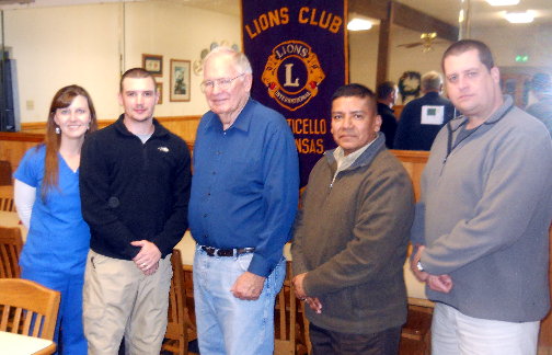 Kyle has been a Monticello policeman 4 years. He is married to the former Amber Nixon, a registered nurse. They have two children, ages 8 and 4. Shown in picture are Amber and Kyle Berryman, Lions Club President Don Hogue, Police Capt Carlos Garcia and Chief Eddie Deaton.