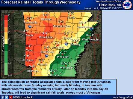 Beryl Barrels toward AR – Forecast Rainfall Totals Through Wednesday