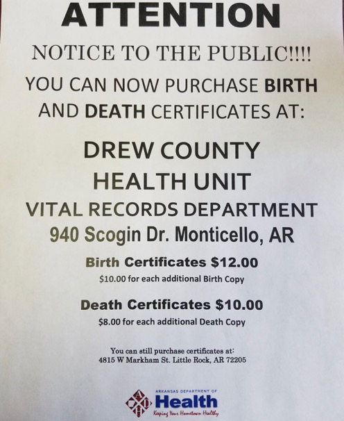 Birth & Death Certificates Now Available at Drew County Health Dept.