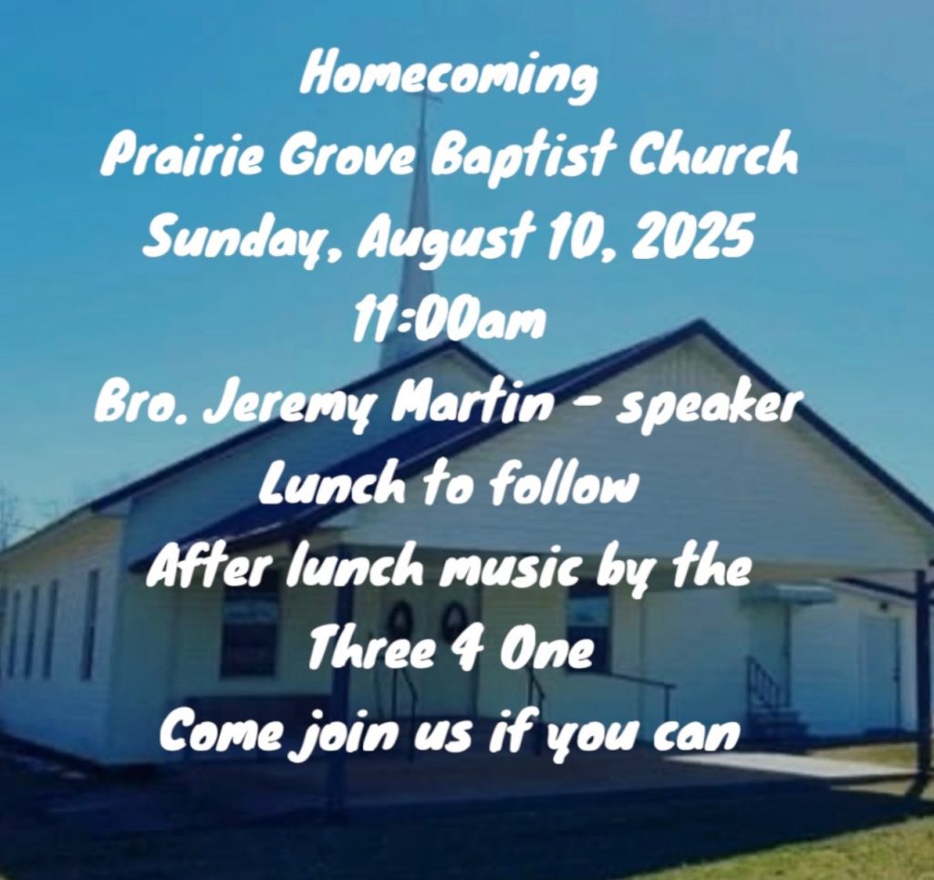 Posted in Church , Site | Comments Off on Homecoming, Prairie Grove Baptist Church, Sunday, August 10