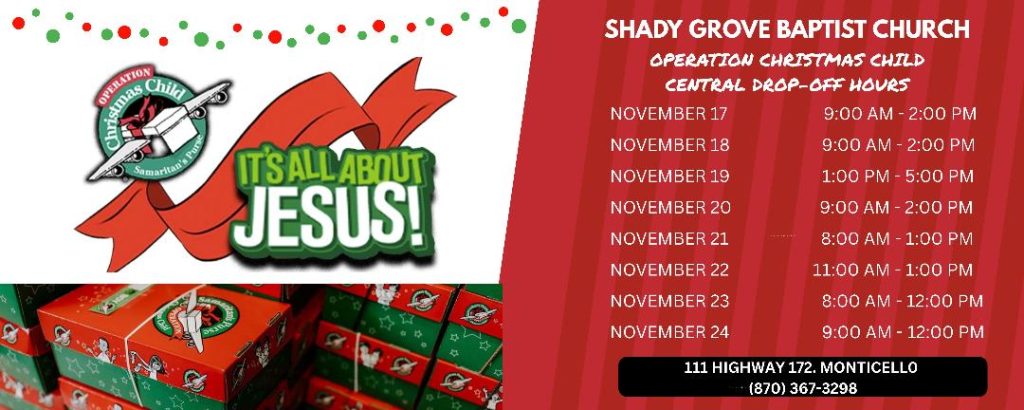 Operation Christmas Child National Collection Week is November 17-24. Start packing your gift-filled shoeboxes and drop them off at Shady Grove!