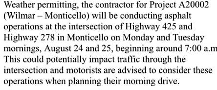 Posted in City, Drew Central News, Monticello School News | Comments Off on 1st Day of School Traffic & Asphalt Overlay Meet at 425/278, 7 AM, Monday.