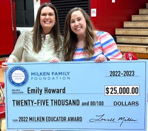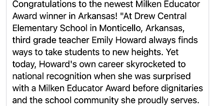 Drew Central third grade teacher, Emily Howard, was surprised this morning, when Arkansas Governor Sarah, Huckabee Sanders, along with Arkansas department of education representatives, presented her with the Milken educator reward, for excellence in teaching.