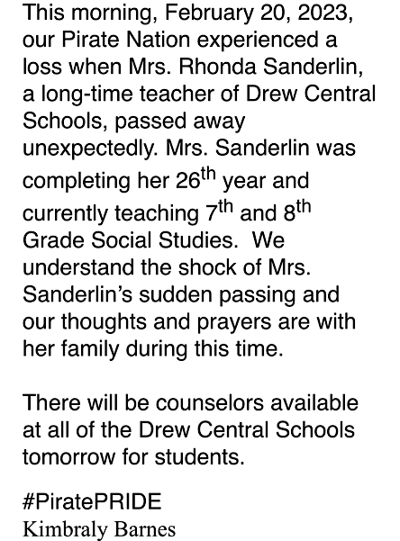 Posted in Drew Central News, In memory | Comments Off on Pirates’ Mrs. Rhonda Sanderlin Unexpectedly Passes Away, Monday.