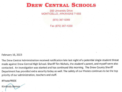 Posted in Drew Central News | Comments Off on Drew Central Receives Notification Of Potential Threat, Drew County Sheriff Provides Extra Security