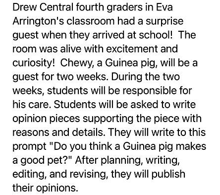 Posted in Drew Central News | Comments Off on Drew Central Fourth Graders Learn to Write Opinion Pieces with Help from Chewy