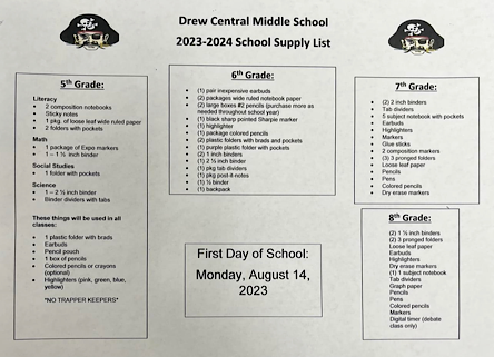 Posted in Drew Central News | Comments Off on DREW CENTRAL SCHOOL SUPPLY LIST