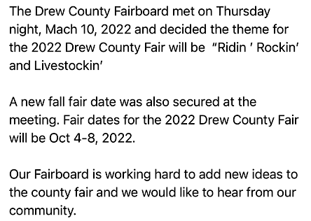 Posted in Fair | Comments Off on Drew County Fair Set for October!