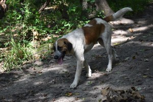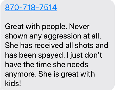 A lady found 2 dogs on Rock Springs Rd. at a deer camp area. This one is one of them and the little brown one has on orange collar and wasn’t caught. Please call 870-820-1969.