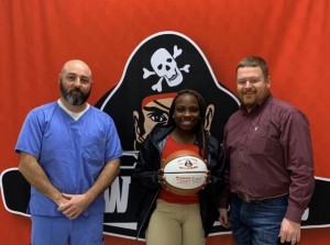 He is shown being congratulated by Keith Wells of the Monticello school board.